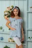 Майка детская летняя для девочек, свободного покроя на тонких бретелях, с накладным кармашком на полочке. По горловине и рукавам настрочена декоративная ажурная резинка. Все срезы в изделии обработаны декоративной краеобметачной строчкой.