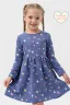 Платье для девочек дошкольного и младшего школьного возраста, из трикотажного полотна кулирка с лайкрой с рисунком. Платье прилегающего силуэта, отрезное и расклешенное от линии талии, с втачным длинным одношовным рукавом, с обтачкой в горловине. Низа рукавов и нижней части платья подогнуты. По шву втачивания обтачки в горловину проложена отделочная строчка.