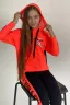 Толстовка прямая, свободная, с капюшоном из сетки, с удлиненной спинкой. Рукав длинный, со вставкой из сетки вдоль рукава, на эластичном манжете. На полочке расположен карман "кенгуру".