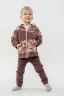 Костюм выполнен из футера двунитки. Комплект из брюк и худи на молнии с капюшоном. Яркие принты на плечах и в центральной части худи. Брюки выполнены в однотонном исполнении со стандартной линией талии.