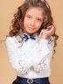 Блузка на пуговицах приталенного силуэта. Пуговицы дополнены стразами, передняя часть и рукава декорированы кружевом и вышивкой. Модель дополнена съёмной брошью. Классический элемент школьной формы прекрасно вольется в гардероб каждой девочки.