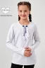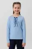 Блузка для девочек младшего и старшего школьного возраста, из однотонного трикотажного полотна. Блузка прилегающего силуэта, с втачным рукавом. Спереди и на спинке отсутствуют линии членения. По центру переда настрочено жабо из кружева. Рукава длинные. Низа рукавов и изделия подогнуты. Горловина окантована. Спереди прикреплен декоративный элемент.