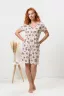 Халат на молнии, полуприлегающего силуэта, длиной выше колена, с V-образной горловиной, с накладными карманами. Рукав втачной, короткий. В нижней части боковых швов обработаны разрезы. Горловина и низ рукавов обработаны бейкой, из основного полотна, с отделочным кантом.