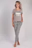 Костюм женский с брюками и футболкой. Футболка свободного кроя с блестящим эскизом и мягкой тканью. Брюки с модным мелким рисунком, эластичным поясом со шнурками для регулировки удобства во время носки. Модель выполнена из высококачественного кулирного гладья с добавлением лайкры.