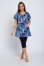Костюм выполнен из трикотажного полотна кулирка. Костюм состоит из туники и бридж. Туника выполнена из набивного полотна. Силуэт свободный. На полочке рельефы, спущенное плечо, углубленная пройма. Подрез ниже груди, V- й вырез горловины. Имитация застежки до подреза. Карманы в подрезных бочках. Горловина, застежка низ рукава, карман окантованы тканью компаньон. Бриджи прямые, притачной пояс на резинке.