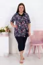Женский дачный костюм с леггинсами темно-синего однотонного цвета и туникой с карманом темно-синего цвета с розовыми и белыми цветами, небольшие принты на кармане и планке у ворота