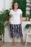 Костюм женский: футболка и бриджи. Футболка прямого силуэта, рукав цельнокроенный короткий, вырез V-образный, в боковом шве разрезы. На полочке модный принт. Бриджи полуприлегающие, длина ниже колена, с хорошей прибавкой на свободу движений. На передней части брюк внутренние карманы. На модели 52 размер. На фото майка из той же коллекции 9126