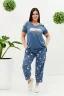 Костюм женский: туника и брюки. Туника прямого силуэта, вырез Y-образный. Полочка несколько короче спинки, сбоку разрезы. На полочке принт. Рукав не цельный, два хляста, расположенные через расстояние друг от друга, втачаны в боковые части рукава. Брюки свободные, "бананы", внизу передней и задней части по две встречные складки, манжеты. В брюках удобные внутренние карманы, пояс выполнен на многоигольной машине.