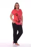 Лаконичный брючный костюм на фигуры больших размеров ( р. 62-74) из меланжированного хлопкого трикотажа "березка". Состоит из яркой туники со спущенным рукавом длинной до ягодиц и прямых темных брюк на поясе с резинкой в боковых швах обработаны карманы.