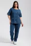 Костюм состоит из жакета и брюк. Жакет с застежкой на петли и пуговицы, прямого силуэта, с округлой горловиной, длиной до середины бедра. Спинка с кокеткой и складками, удлиненная. На полочке расположены накладные карманы. В нижней части боковых швов обработаны разрезы. Рукав короткий, с манжетом и патой. Горловина обработана обтачками. Брюки на поясе, с боковыми карманами, спереди со складками по шву притачивания пояса, сзади с кокетками.