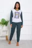 Костюм женский выполнен из меланжированной кулирки. Кофта с длинным рукавом снизу на резинки, на полочке выполнена печать. Брюки свободного силиэта, по бокам карманы, низ брюк на резинке