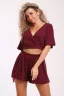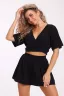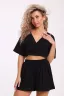Костюм состоит из топа и шорт. Топ с лифом на запах и короткими цельнокроеными рукавами. Шорты свободного кроя и с высокой посадкой.