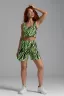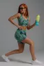 Комплект состоит из топа и шорт. Топ на узких бретелях, с округлой горловиной на полочке и вырезом "борцовка" сзади. Горловина, проймы и вырез на спинке обработаны бейкой из основного полотна. Шорты на поясе, свободные, с боковыми карманами, с декоративными отворотами по низу. В верхней части передних половинок по шву притачивания пояса расположены складки.