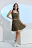 Комплект состоит из топа и юбки. Топ на широких бретелях из эластичного полотна с контрастными полосками, с квадратной горловиной, с декоративной молнией. Бретели и верх спинки обработаны бейкой из основного полотна. Юбка расклешенная, на поясе.