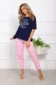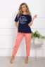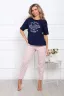 Пижама женская: футболка с короткими рукавами с принтом на полочке, брюки разных расцветок с боковыми карманами.