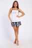 Пижама женская выполнена из трикотажного полотна кулирка. Пижама состоит из топа и шорт. Топ из однотонного полотна. Топ на тонких бретельках, на полочке выполнена печать. Шорты с цельнокраенным поясом и фигурным низом.