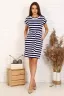 Платье женское из вискозы полуприталенного силуэта с поясом. Расцветка сине-белая поперечная полоса. Длина выше колена. Рукав короткий цельнокроенный с манжетом. В боковых швах изделия обработаны внутренние карманы. Круглый вырез горловины окантован бейкой из основного материала.