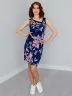 Платье прямого силуэта, длиной чуть ниже линии колена. По переду, в области груди ассиметричная драпировка, которая собрана на металлическое кольцо - подкову.